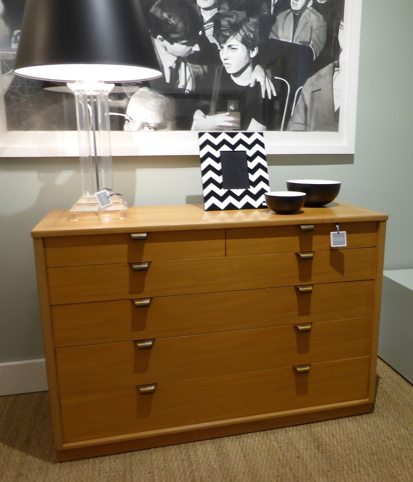 Designed by Edward Wormley in 1947 as part of the "Precedent" collection for Drexel Furniture Co., this chest is made of lustrous silver elm. While it is thoroughly modern, the arrangement of drawers and the hardware recall earlier architect and drafting cabinets. 48"l., 19"d., 32 1/2"h. American, c.1947 SOLD