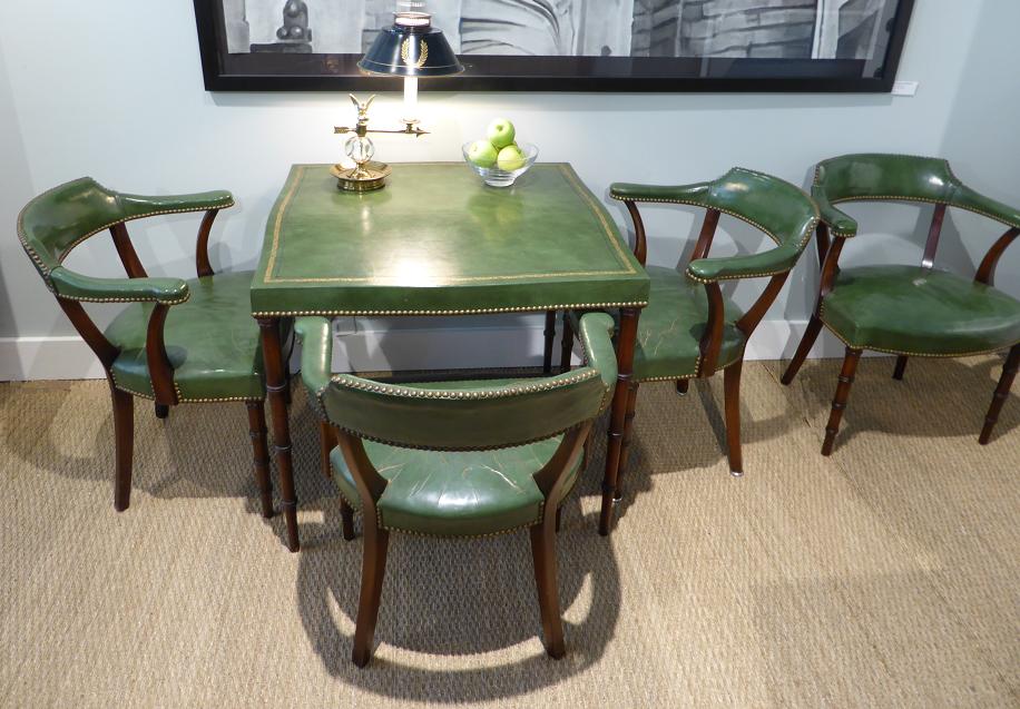The Barnard and Simonds Furniture Company was founded in New York in 1898, moved to Michigan in 1959, and was purchased by Baker Furniture in 1967. They specialized in very fine quality American and English Country reproductions and adaptations. We love this classic leather games/ library/ breakfast table and chairs with brass tacks and mahogany faux bamboo legs. The table has gold embossing and a slightly scalloped skirt. A set of four chairs without the table in similar condition recently sold on Chairish and was listed at $3,800.00 U.S. https://www.chairish.com/product/611163/barnard-simonds-leather-library-chairs-set-of-4