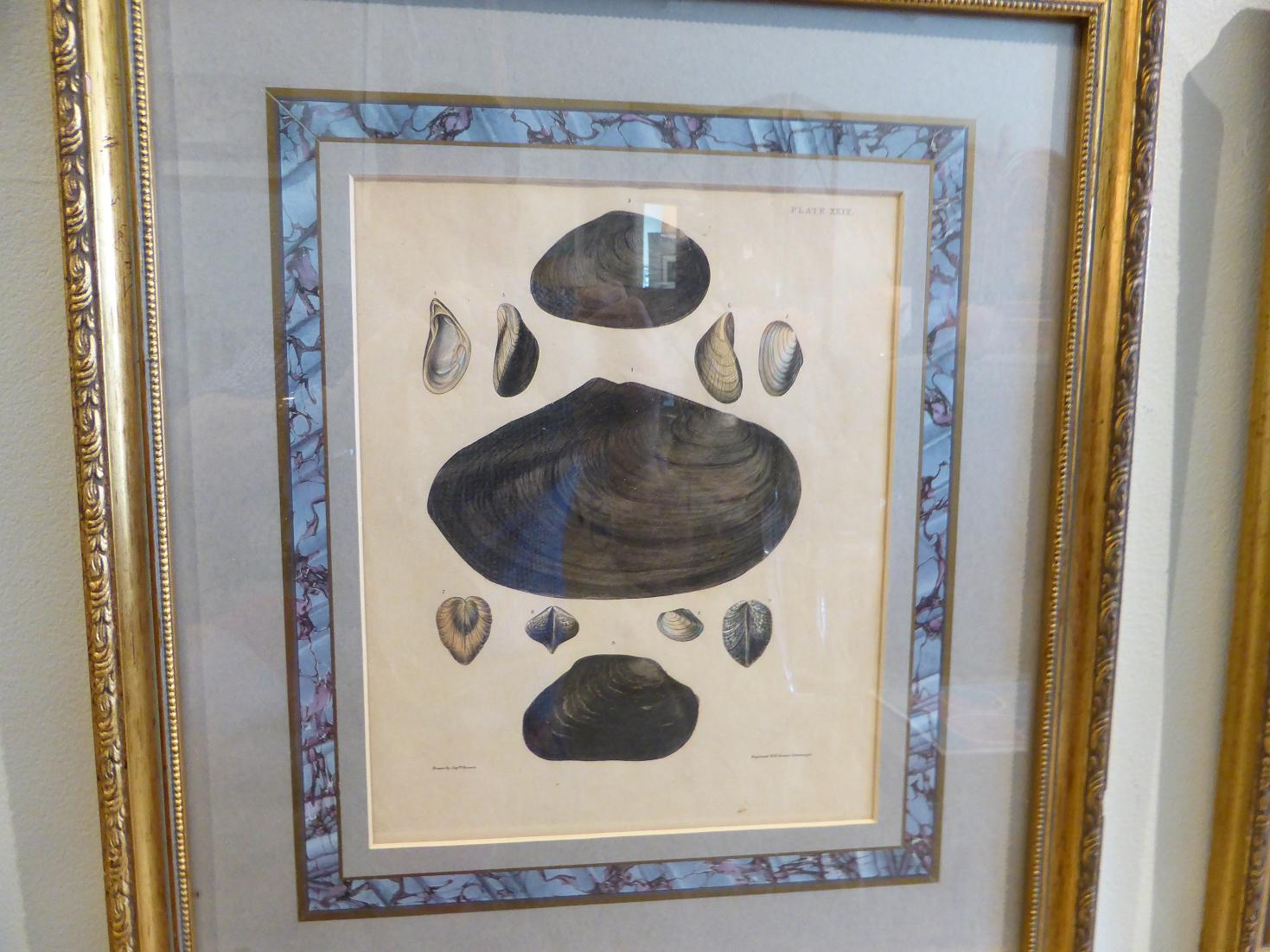 This set of four beautifully framed prints are original, hand-colored illustrations from Captain Thomas Brown's 1827 Conchology of Great Britain and Ireland. Captain Brown was a well-known 19th c. British artist and naturalist. He traveled extensively and drew his subjects from live specimens found on his travels. The four engraved plates have grey mats with marbelized paper decoration and gilt wood frames. Frames, 18.5" h., 16.5" w. English, c. 1827 SOLD